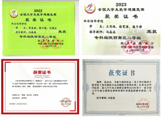 對于競賽指導,馮晶晶成績斐然,指導學生分別獲得2023全國大學生數(shù)學建模競賽陜西賽區(qū)二等獎、西安培華學院第二屆大學生統(tǒng)計建模競賽三等獎等。