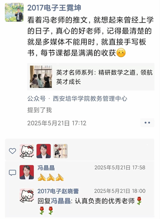 針對學習困難的學生,馮晶晶建立了專門的幫扶檔案,定期與學生談心交流,分享高效學習方法,還鼓勵他們嘗試成為“小老師”。當學生通過自己的努力向同伴講清知識點時,那份被點燃的自信與成就感,成為他們主動成長的強大動力。這份用心,讓畢業(yè)多年的學生仍念念不忘——2017級電子專業(yè)的王霓坤在朋友圈轉發(fā)馮晶晶的推文時寫道:“真心的好老師,記得最清楚的就是手寫板書,每節(jié)課都是滿滿的收獲!