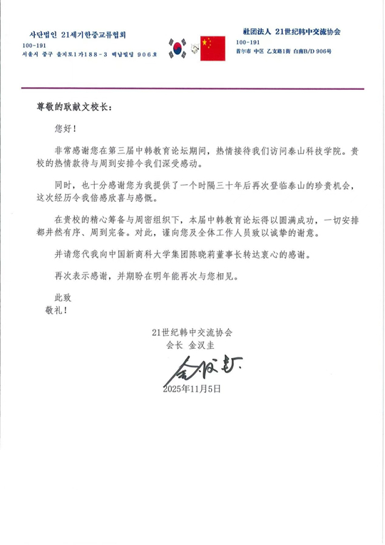 | 第三屆中韓教育論壇成果豐碩,韓中交流協(xié)會會長金漢圭專函致謝泰山科技學(xué)院 |