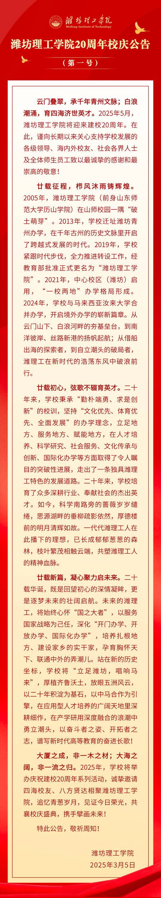 濰坊理工學(xué)院20周年校慶公告(第一號)