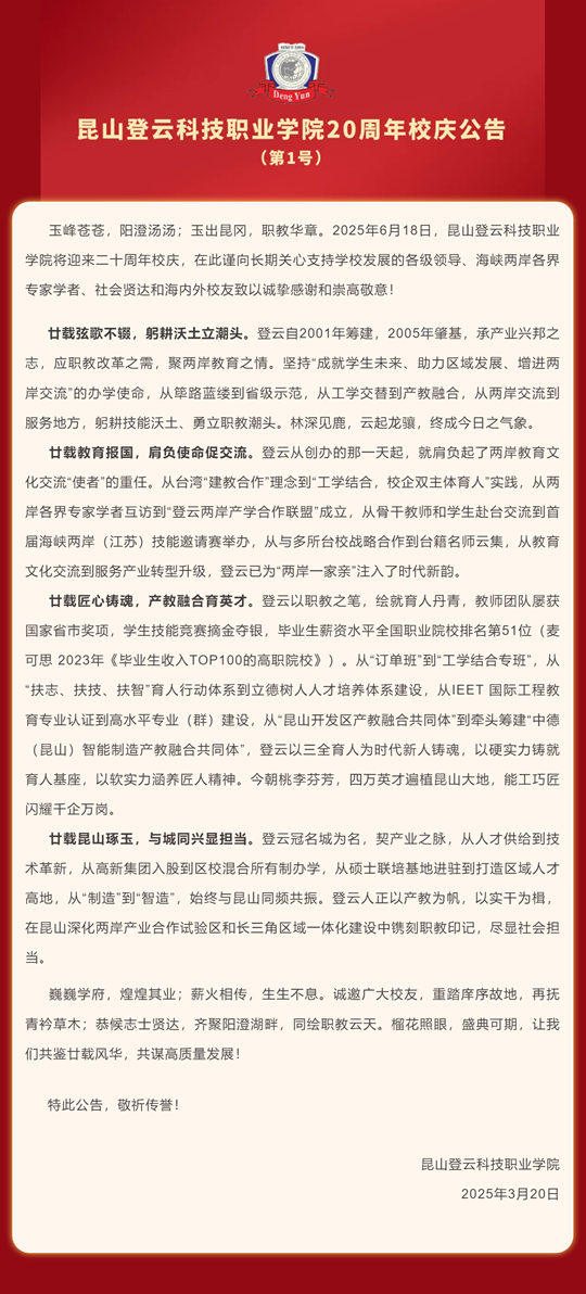昆山登云科技職業(yè)學(xué)院20周年校慶公告 (第1號(hào))