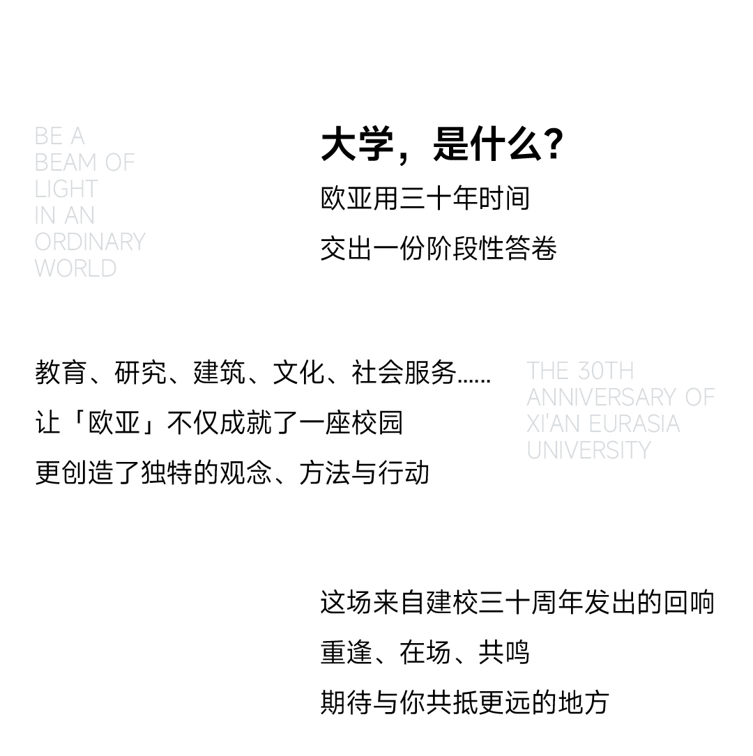 30年,是西安歐亞學(xué)院持續(xù)追問、探索和塑造大學(xué)樣子的里程,是思想的發(fā)生地、關(guān)系的連接點以及創(chuàng)新的實踐場。10月,西安歐亞學(xué)院將迎來建校30周年系列慶典活動,邀你共同見證一所大學(xué)的“而立”時刻: