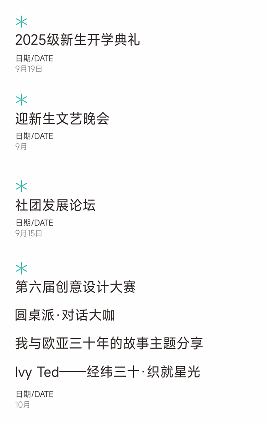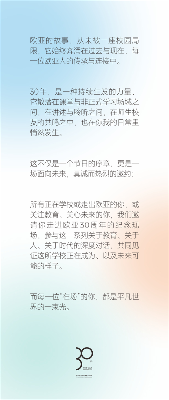 值此相聚時刻,歐亞將舉辦“創(chuàng)意設(shè)計大賽”,記錄當(dāng)下最具想象力的師生協(xié)作;通過“我與歐亞三十年”的故事分享,回望那些彼此照亮的瞬間;Ivy青年社區(qū)特別策劃的“經(jīng)緯三十·織就星光”Ted演講,串起30年間的教育智慧與溫度;匯聚行業(yè)視角與教育思考的圓桌派,對話教育的現(xiàn)在與未來。