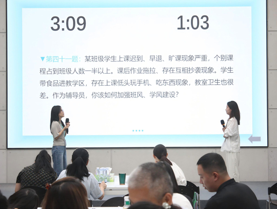 訓(xùn)練營現(xiàn)場,輔導(dǎo)員們?nèi)橥度,充分展現(xiàn)出了輔導(dǎo)員隊伍專業(yè)化職業(yè)化的素養(yǎng)。在案例研討、談心談話環(huán)節(jié),輔導(dǎo)員們精準(zhǔn)聚焦關(guān)鍵問題,分享一線育人經(jīng)驗,講述學(xué)生成長故事,傳遞價值理念。評委團隊全程參與,結(jié)合國家政策導(dǎo)向和高校思政工作要求,對輔導(dǎo)員現(xiàn)場表現(xiàn)進行點評與指導(dǎo),激勵大家持續(xù)提升業(yè)務(wù)能力,將訓(xùn)練營所學(xué)轉(zhuǎn)化為育人實效,助力學(xué)生成長成才。