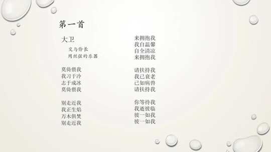 《大衛(wèi)》這首詩的妙趣,在于“既是《詩經(jīng)》,又是《圣經(jīng)》”的奇妙互文。童明指出,詩中“大衛(wèi)”是《圣經(jīng)-詩篇》的敘述者;副標(biāo)題借用了《詩篇》的格式,而“絲弦樂器”帶有中國民樂元素。這樣,既保留了大衛(wèi)對神傾訴的口吻(如《詩篇》中“我的上帝,為何遺棄我”的抱怨與依賴),又注入了東方文化中含蓄的情感表達(dá)(如“我自溫馨,自全清涼”等),兩種文明在同一首詩里共存,相映成輝。