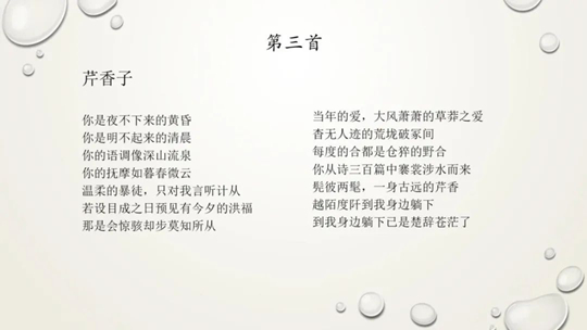 《芹香子》是一首商籟體的情詩,但既不是莎士比亞式的商籟格式(4+4+4=2),也不同于佩脫拉克式的商籟格式(8+6),而是以前后各七行(7+7)的對照形成獨(dú)特的韻律。童明認(rèn)為,木心的十四行詩,雖然不嚴(yán)格押韻,卻注重內(nèi)在的節(jié)奏律動(dòng)。詩中“我”大概是女性。對比《詩經(jīng)》中“淑女”和“子都”(美男子)之間的情話,木心的“芹香子”是個(gè)新的稱謂,取其樸實(shí)和清新。