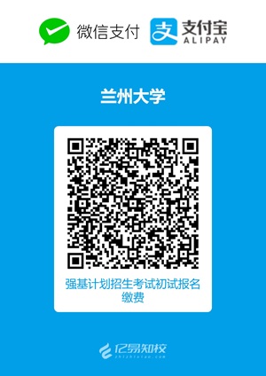 已報(bào)名蘭州大學(xué)2025年強(qiáng)基計(jì)劃招生考試并通過(guò)審核的第一類(lèi)考生,請(qǐng)于2025年5月23日00:00-6月10日16:00登錄蘭州大學(xué)強(qiáng)基計(jì)劃報(bào)名平臺(tái)(https://bm.chsi.com.cn/jcxkzs/sch/10730)進(jìn)行強(qiáng)基計(jì)劃招生考試初試確認(rèn)并通過(guò)微信或支付寶掃描下方二維碼進(jìn)行繳費(fèi)。逾期未確認(rèn)考試及繳費(fèi)的考生,視為放棄后續(xù)選拔。繳費(fèi)完成的考生,如需電子收據(jù),請(qǐng)于2025年7月10日之前通過(guò)電子郵箱(zsks@lzu.edu.cn)聯(lián)系蘭州大學(xué)招生辦公室。