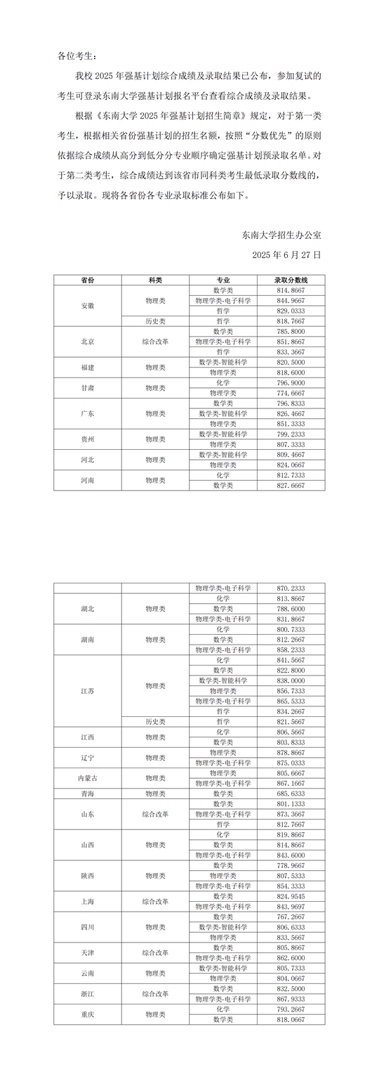 東南大學(xué)2025年強基計劃錄取結(jié)果公布