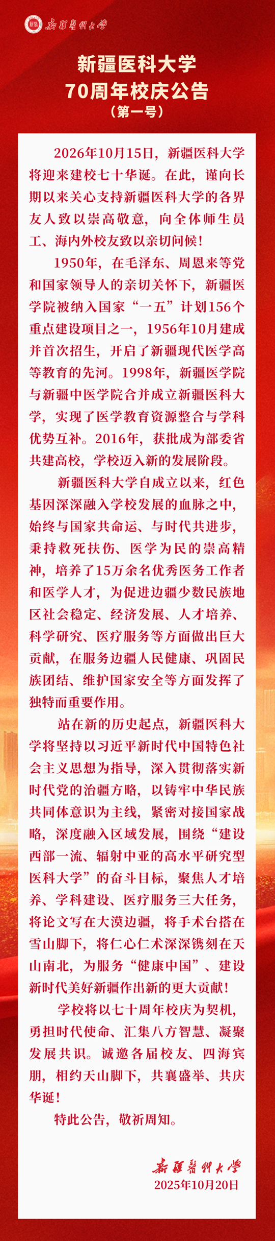 新疆醫(yī)科大學70周年校慶公告(第一號)