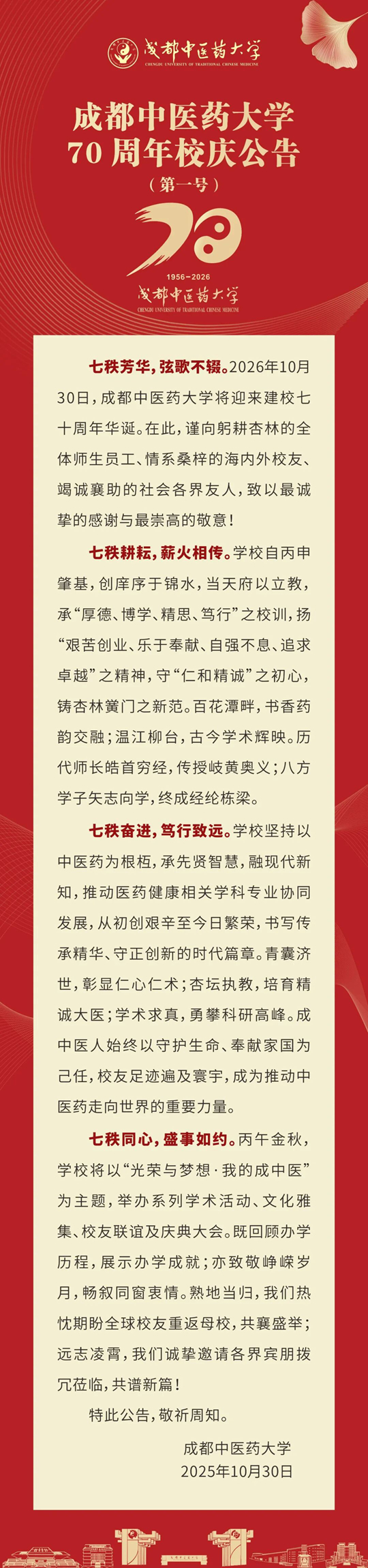成都中醫(yī)藥大學(xué)70周年校慶公告(第一號)