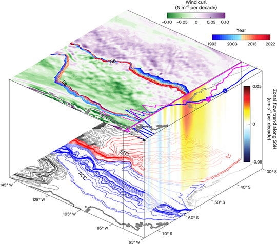 Drake Passage maintains a stable circumpolar transport”(德雷克海峽上游南極繞極流南移維持其環(huán)南極流量穩(wěn)定)的最新研究成果。該研究揭示,在最近30年全球變暖背景下,南大洋雖然因南北增暖不均造成其北部的緯向流加速,但是南極繞極流的北邊界也發(fā)生了南移,使得增強(qiáng)的流動(dòng)被分流至亞熱帶的南大洋超級(jí)環(huán)流,從而維持了南極繞極流在其整個(gè)流域中的流量穩(wěn)定。