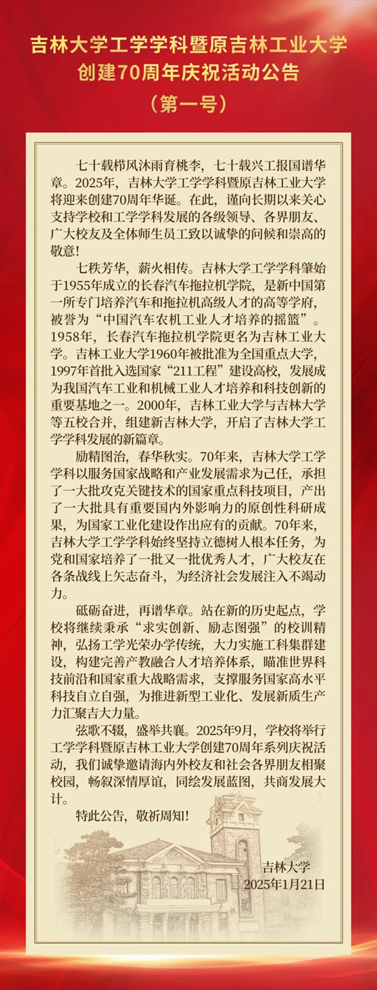 | 吉林大學(xué)工學(xué)學(xué)科暨原吉林工業(yè)大學(xué)創(chuàng)建70周年慶祝活動(dòng)公告(第一號(hào)) |