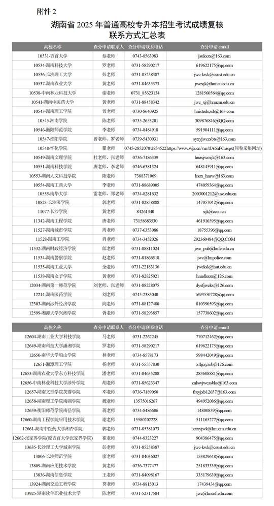 2.湖南省2025年普通高校專升本招生考試成績復(fù)核聯(lián)系方式匯總表