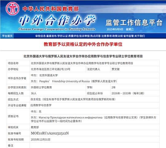 近日,教育部中外合作辦學(xué)監(jiān)管工作信息平臺(tái)公布經(jīng)批準(zhǔn)設(shè)立和舉辦的中外合作辦學(xué)項(xiàng)目名單,北京外國語大學(xué)與俄羅斯人民友誼大學(xué)合作舉辦的應(yīng)用數(shù)學(xué)與信息學(xué)專業(yè)碩士學(xué)位教育項(xiàng)目通過資格認(rèn)定,將于2026年秋季啟動(dòng)首批招生。這是北外獲批設(shè)立的第五個(gè)中外合作辦學(xué)項(xiàng)目。