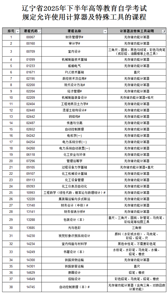 附件:遼寧省2025年下半年高等教育自學(xué)考試規(guī)定允許使用計算器及特殊工具的課程