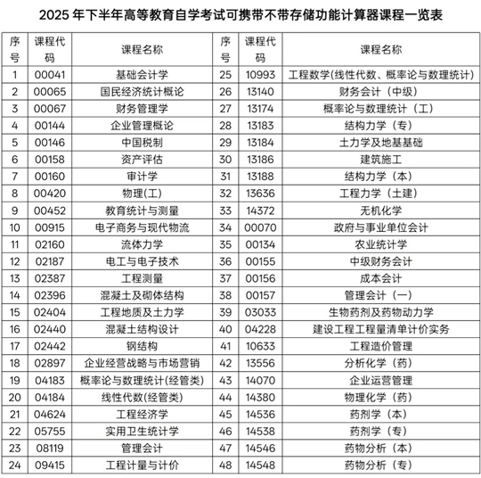 考生可攜帶不帶存儲功能的計(jì)算器參加部分課程考試,詳情見下表。