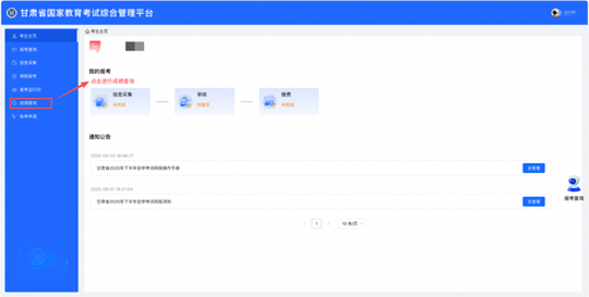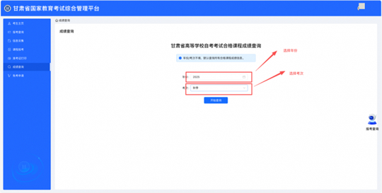 考生進入系統(tǒng),通過“自學(xué)考試” 板塊,點擊 “立即進入”,進入自學(xué)考試界面,點擊 “成績查詢” 菜單,選擇要查詢的年份及考次,進行成績查詢。
