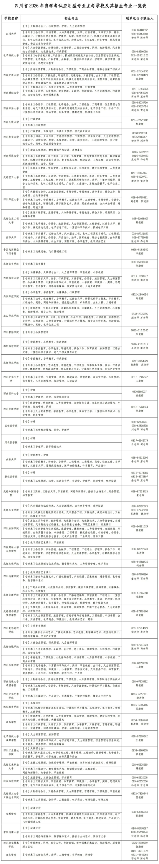 自學考試是我國高等教育的重要組成部分,是個人自學、社會助學和國家考試相結(jié)合的高等教育形式。為促進自學考試持續(xù)健康發(fā)展,省招考委、教育廳同意四川大學等50所高等學校為我省2026年高等教育自學考試應用型專業(yè)的主考學校,并開展自學考試助學工作,現(xiàn)將有關高等學校、主考專業(yè)及相關情況通告如下: