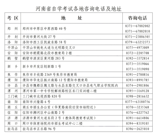 。ǘ┛忌趫竺^程中遇到問題可撥打報名所屬考區(qū)教育招生考試機構(gòu)咨詢電話(聯(lián)系方式見下文)反映解決問題。同時,密切關(guān)注官方網(wǎng)站“河南省教育考試院”(http://www.haeea.cn)、“河南招生考試信息網(wǎng)”(http://www.heao.com.cn)、“河南省高等教育自學(xué)考試考生服務(wù)平臺(zkwb.haeea.cn)”和官方微信公眾號“河南省教育考試院”“招考豫言”及各考區(qū)教育招生考試機構(gòu)發(fā)布的相關(guān)信息。
