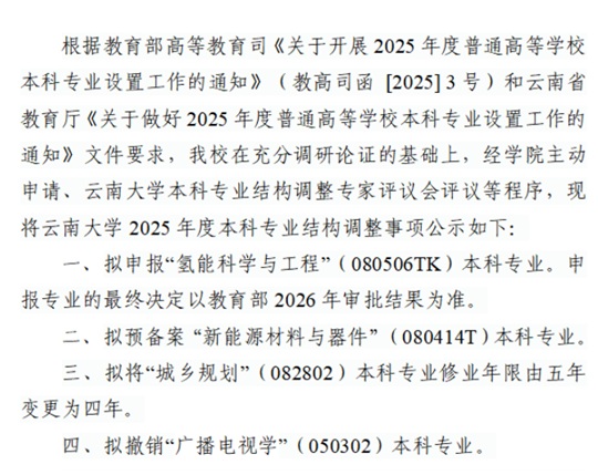 | 云南大學(xué)2025年度本科專業(yè)擬調(diào)整事項(xiàng) |
