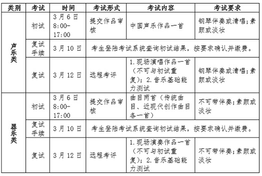 1.音樂學(音樂國際教育與傳播)專業(yè)考生須參加學校組織的線上考試?荚嚌M分為750分,其中初試滿分為300分、復試滿分為450分(作品唱奏400分;音樂基礎能力測試50分,含視唱練耳和樂理)。
