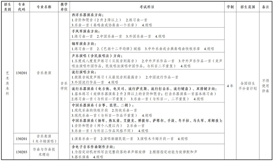 3.我校2025年音樂表演專業(yè)只招收以下所列種類,凡未列出的種類該年不接受報(bào)考,考生應(yīng)使用?紙(bào)名時(shí)所選的唱法或樂器種類進(jìn)行演奏。具體如下: