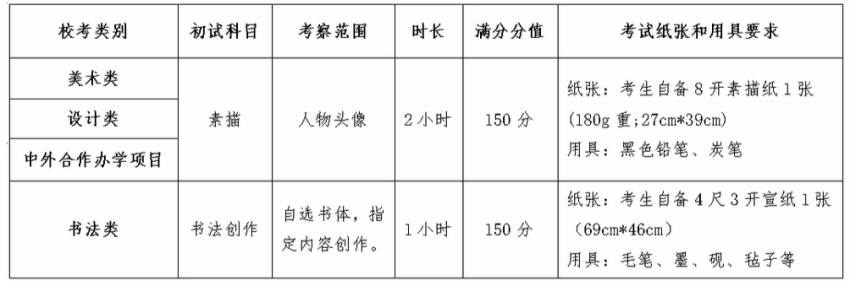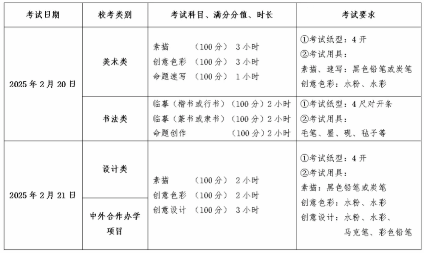 我校2025年藝術(shù)類校考專業(yè)按“網(wǎng)絡(luò)初試+現(xiàn)場(chǎng)復(fù)試”的模式組織考試,?碱悇e分美術(shù)類、設(shè)計(jì)類、中外合作辦學(xué)項(xiàng)目、書法類,按?碱悇e發(fā)放?己细褡C,按專業(yè)錄取。各?碱悇e包含專業(yè)和省級(jí)統(tǒng)考科類要求詳見(jiàn)下表: