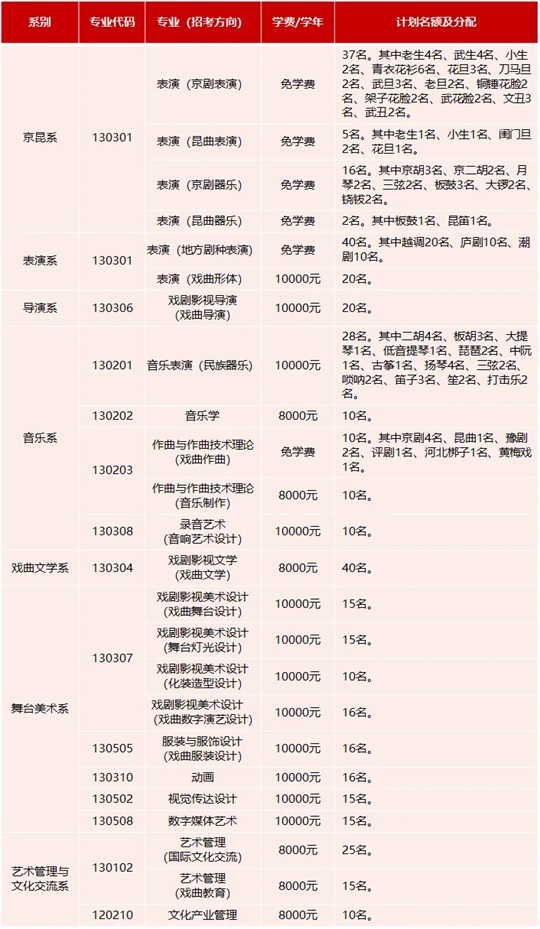 4.戲劇影視文學(xué)(戲曲文學(xué))、藝術(shù)管理(國(guó)際文化交流)、藝術(shù)管理(戲曲教育)和文化產(chǎn)業(yè)管理專業(yè)編制分省計(jì)劃,使用高考文化課成績(jī)進(jìn)行錄取。