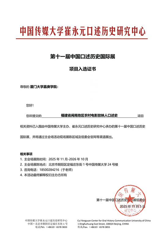 在京期間,廈門大學(xué)嘉庚學(xué)院師生團(tuán)隊(duì)全程參與了中國口述歷史國際展的活動,通過觀摩來自不同國家和地區(qū)、涵蓋多元主題的優(yōu)秀口述歷史項(xiàng)目,團(tuán)隊(duì)成員深度理解口述歷史方法論在記錄歷史、保存記憶方面的巨大潛力與前沿發(fā)展。此外,師生團(tuán)隊(duì)還前往中國電影博物館調(diào)研、采訪,館內(nèi)關(guān)于“流動放映隊(duì)”的歷史展陳,加深了同學(xué)們對閩南農(nóng)村放映人這段歷史的理解,也讓他們更加充分地認(rèn)識到自身工作在國家電影文化宏大敘事中的定位與價(jià)值——即從微觀個(gè)體視角,補(bǔ)全與豐富中國電影歷史的脈絡(luò)。