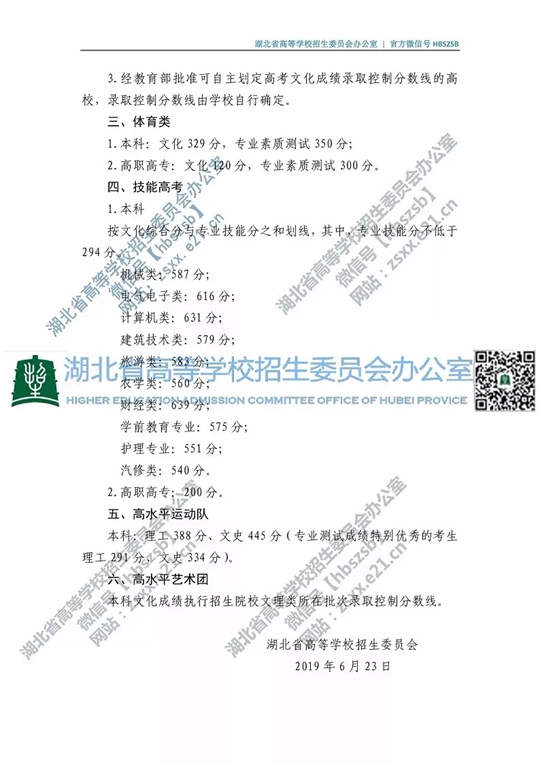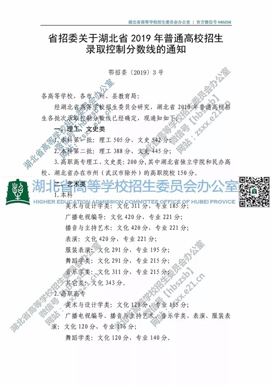 湖北省2019年普通高校招生錄取控制分數(shù)線