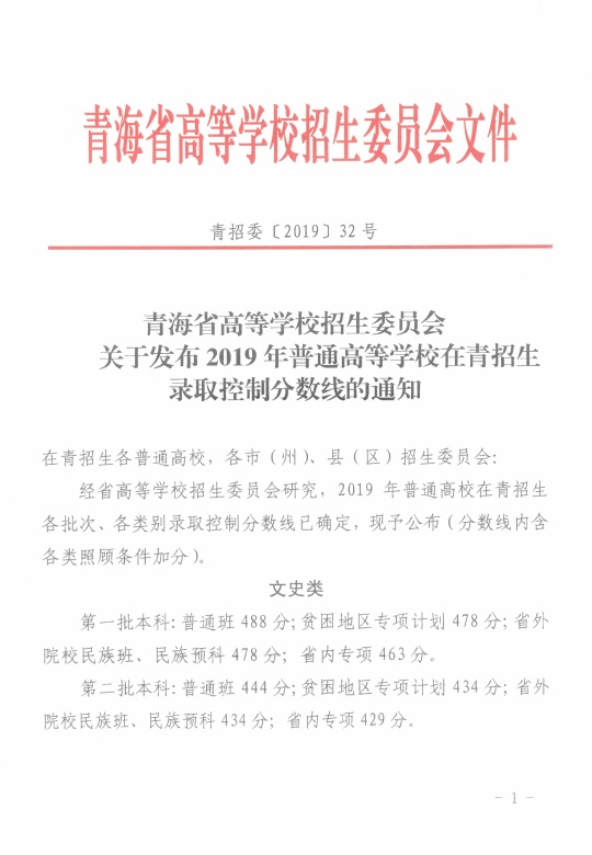 | 青海:關(guān)于發(fā)布2019年普通高等學(xué)校在青招生錄取控制分?jǐn)?shù)線的通知 |