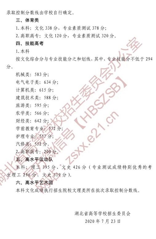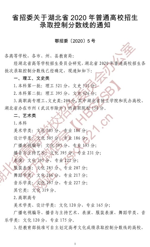 湖北2020年普通高校招生錄取控制分數(shù)線