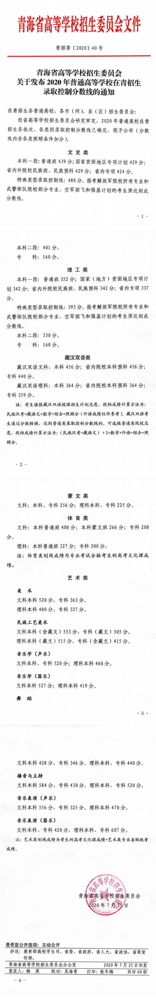 2020年普通高校在青海招生錄取控制分數(shù)線公布