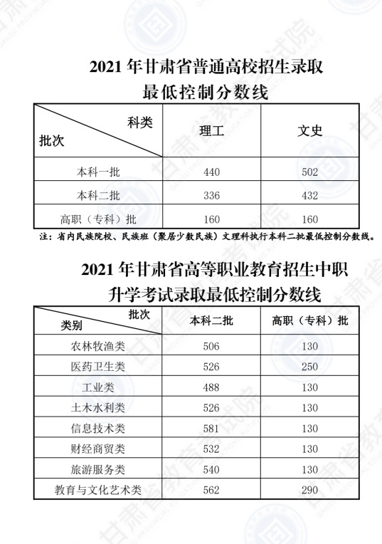 2021年甘肅省普通高校招生錄取最低控制分?jǐn)?shù)線