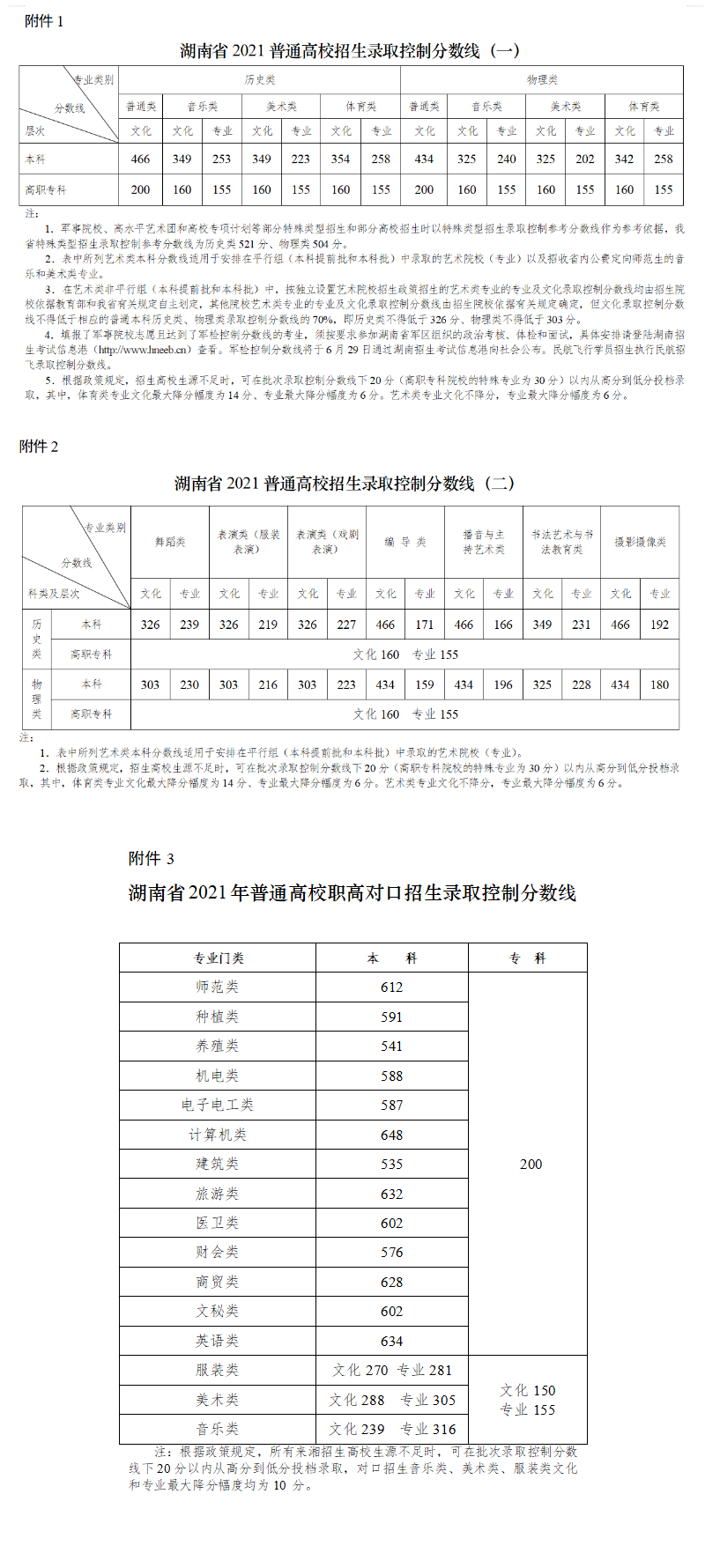 湖南省2021普通高校招生錄取控制分?jǐn)?shù)線