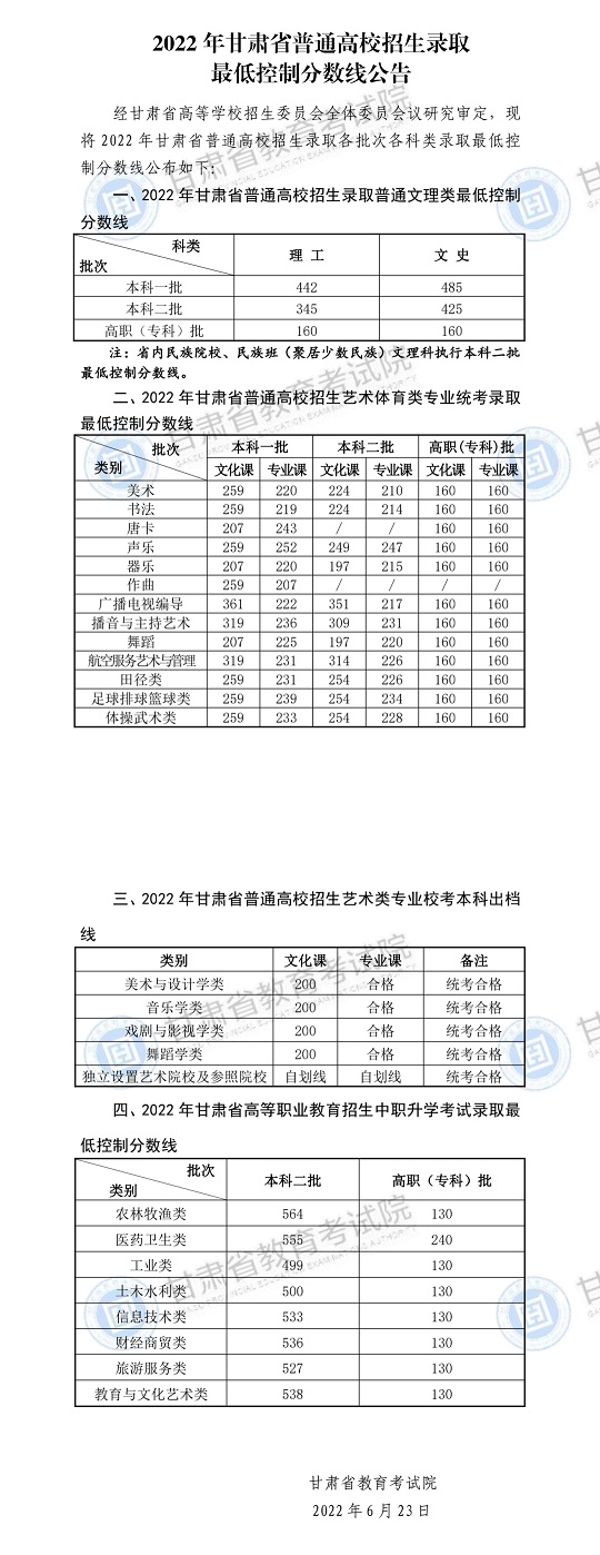 | 2022年甘肅省普通高校招生錄取最低控制分?jǐn)?shù)線 |
