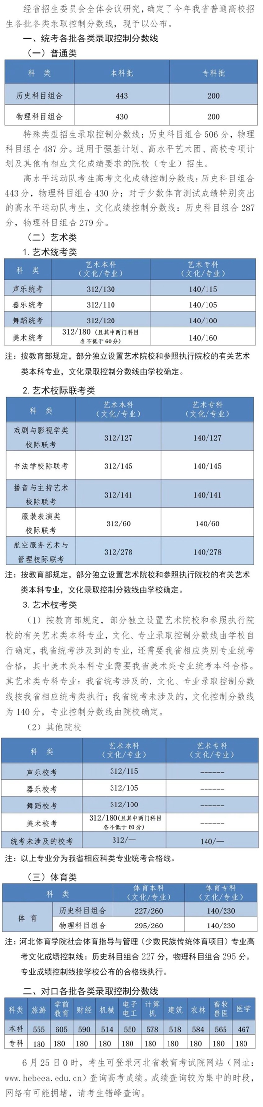 2022年河北省普通高校招生各批各類錄取控制分數(shù)線