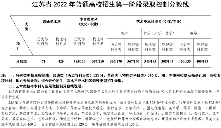 江蘇省普通高校招生第一階段錄取控制分數(shù)線
