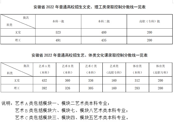 安徽省2022年普通高校招生錄取控制分?jǐn)?shù)線
