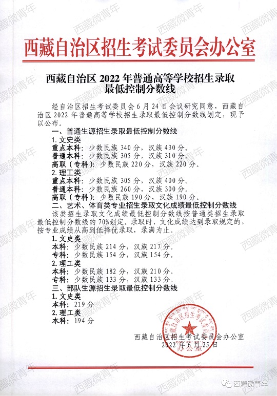 西藏:2022年高考錄取最低控制分?jǐn)?shù)線
