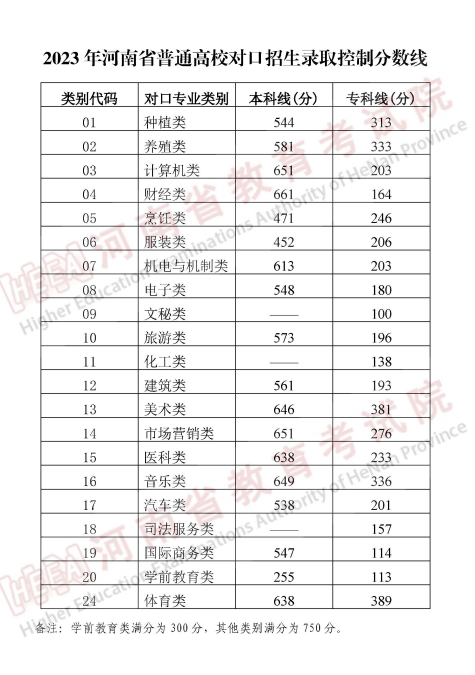 二、2023年河南省普通高校對口招生錄取控制分?jǐn)?shù)線