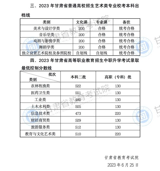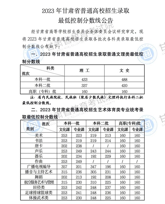 | 2023年甘肅省普通高校招生錄取最低控制分?jǐn)?shù)線公告 |