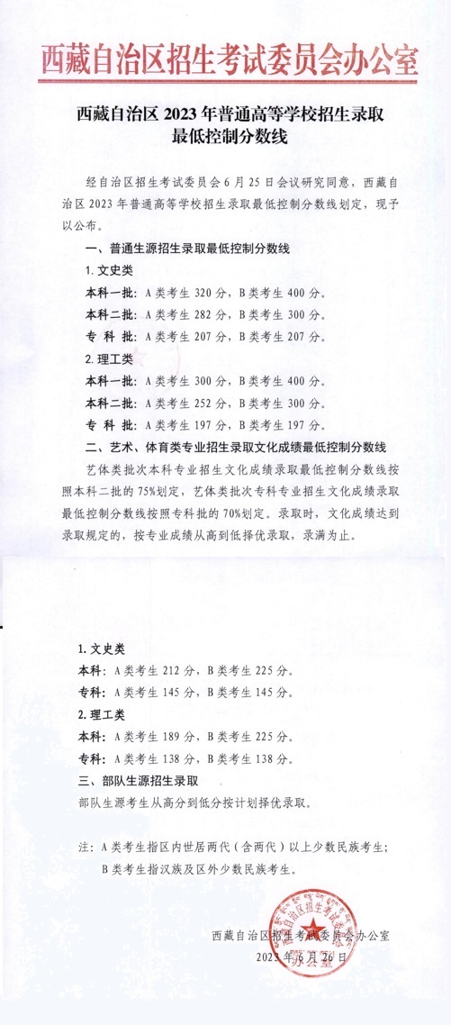 | 西藏:2023年高考錄取最低控制分?jǐn)?shù)線(xiàn) |
