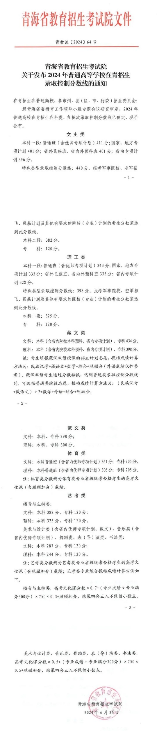 院關(guān)于發(fā)布2024年普通高等學校在青招生錄取控制分數(shù)線的通知 |