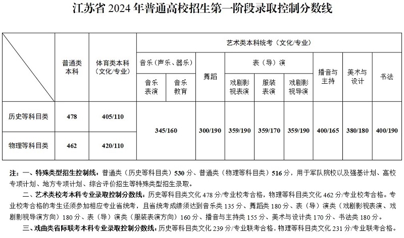 江蘇省2024年普通高校招生第一階段錄取控制分?jǐn)?shù)線