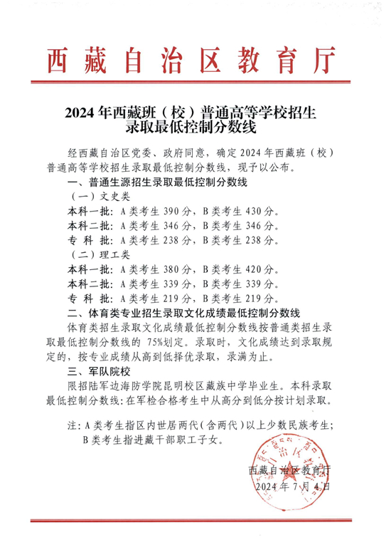 | 2024年西藏班(校)普通高等學(xué)校招生錄取最低控制分?jǐn)?shù)線 |