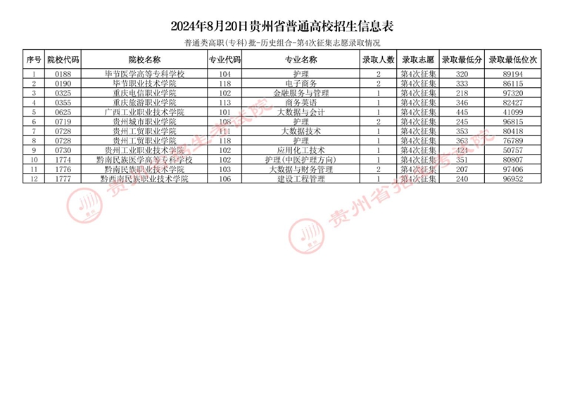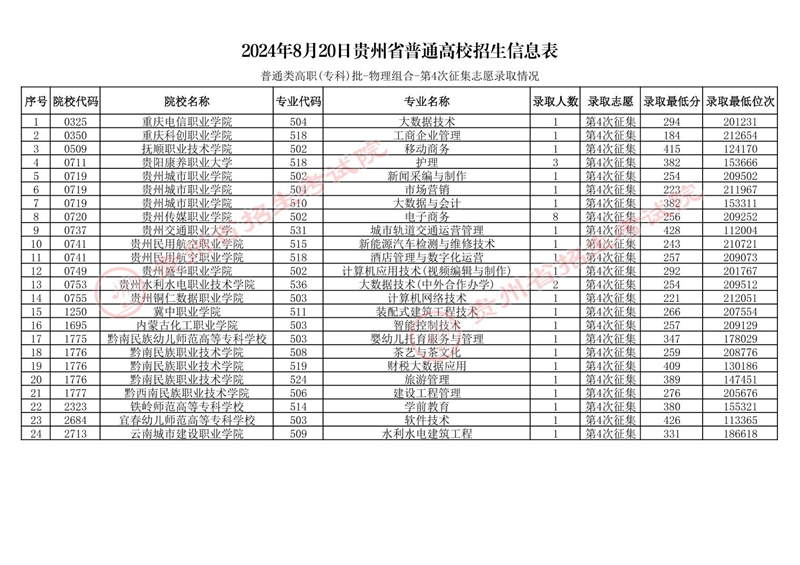 | 2024年8月20日貴州省普通高校招生信息表(普通類高職(?疲┡-第4次征集志愿錄取情況) |