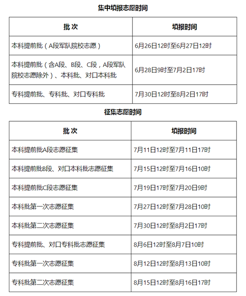 軍隊(duì)(含武警,下同)院校招生計(jì)劃安排在本科提前批A段,實(shí)行順序志愿投檔,設(shè)1次集中填報(bào)志愿和1次征集志愿,考生每次可填報(bào)1所學(xué)校,每所學(xué)校設(shè)6個(gè)專業(yè)志愿和1個(gè)專業(yè)服從調(diào)劑選項(xiàng)。集中填報(bào)志愿時(shí)間為6月26日12時(shí)至6月27日12時(shí)。