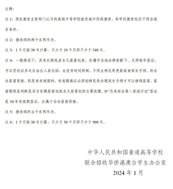 3.華僑考生,考生本人及其父母一方均須取得住在國長期或者永久居留權,并已在住在國連續(xù)居留2年,兩年內注2累計居留不少于18個月注3,其中考生本人須在報名前2年內(即2022年4月1日—2024年3月31日)在住在國實際累計居留不少于18個月注3。