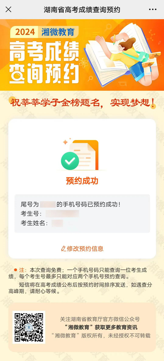 我省2024年高考成績(jī)預(yù)計(jì)6月25日左右公布。為給全省廣大考生和家長(zhǎng)提供優(yōu)質(zhì)、貼心的服務(wù),“湘微教育”特推出“高考成績(jī)查詢預(yù)約”服務(wù)。